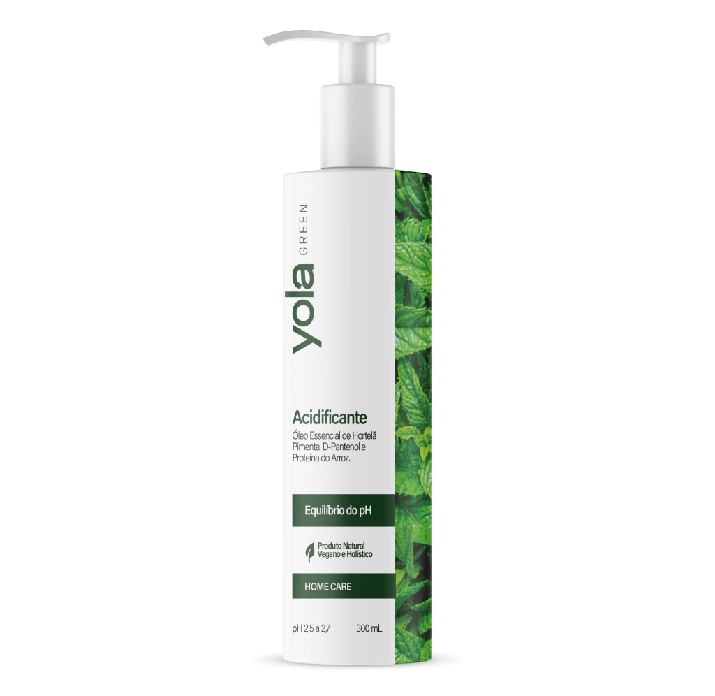 O acidificante Yola Green vem em embalagem de 300 mL com dosador prático. Tem pH entre 2,5 e 2,7, ideal para selar cutículas após tratamentos químicos ou lavagem. Produto natural, vegano e indicado para uso quinzenal ou pós-química.