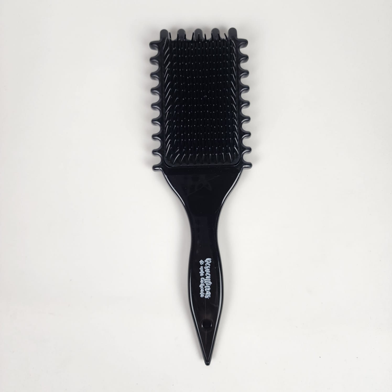 A escova tem formato retangular com laterais onduladas, feita em material plástico preto resistente. As cerdas são distribuídas para garantir melhor fluxo e modelagem uniformes. O cabo pontiagudo facilita a divisão do cabelo para aplicação de fitagem ou outras técnicas de finalização.