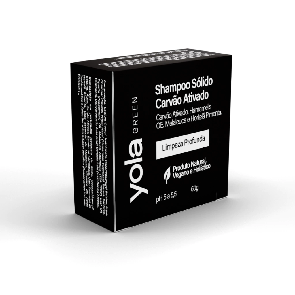 O shampoo sólido vem em barra compacta de 60 gramas, contendo ingredientes naturais como carvão ativado, hamamélis, óleo essencial de melaleuca e hortelã pimenta que auxiliam no cuidado capilar diário. O produto oferece limpeza eficaz sem agredir o couro cabeludo, indicado para todos os tipos de cabelo que necessitam de controle da oleosidade e frescor prolongado.