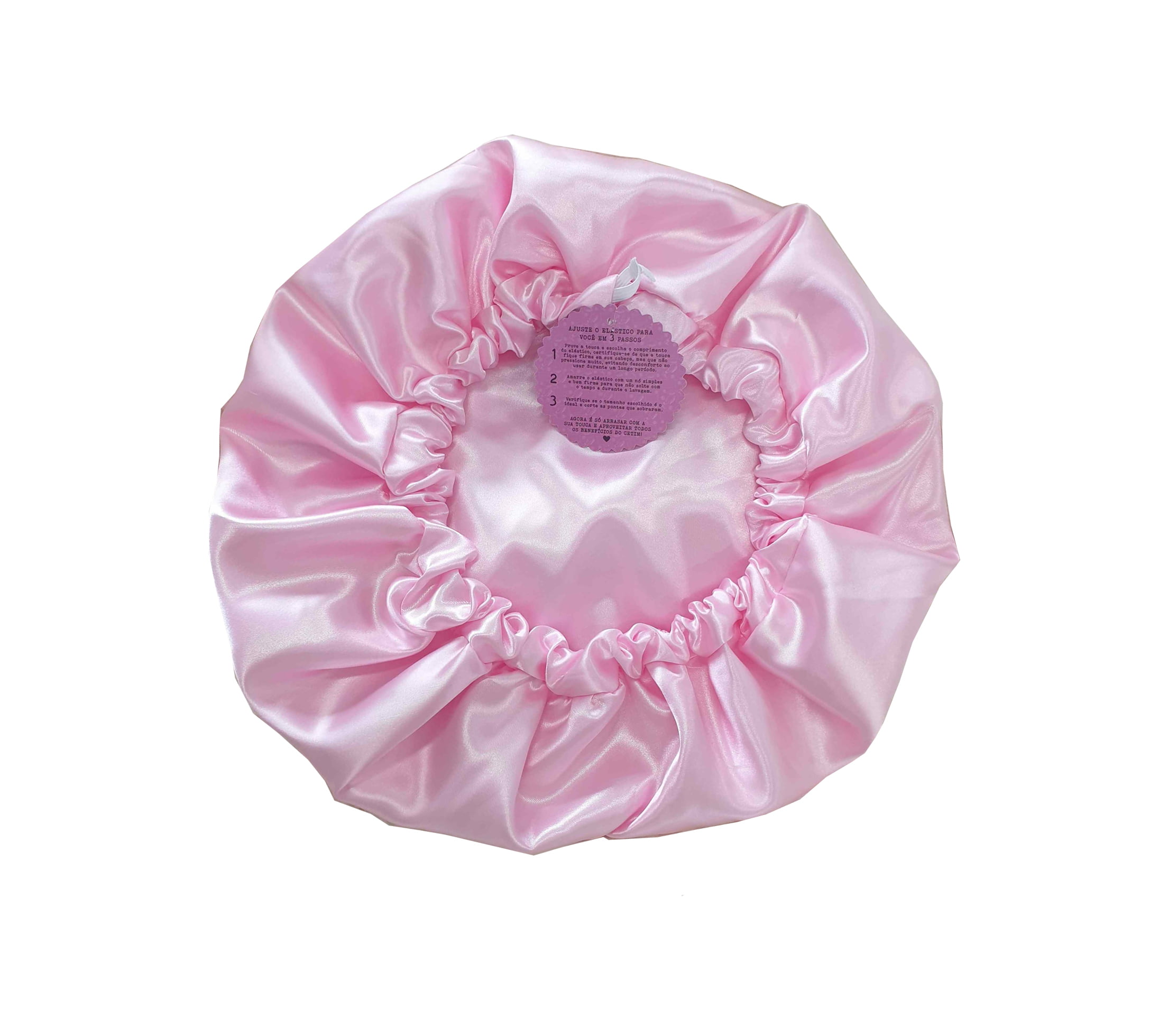 Produzida em cetim rosa bebê, a touca apresenta camada dupla para maior proteção e durabilidade. O elástico ajustável permite fixação confortável em diferentes tamanhos de cabeça, evitando pressão excessiva. O acabamento sedoso do tecido garante que o cabelo deslize sem quebrar ou ressecar.
